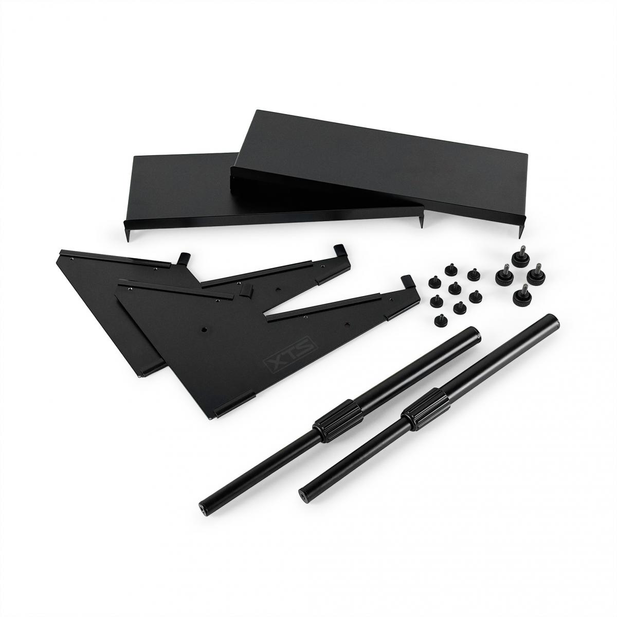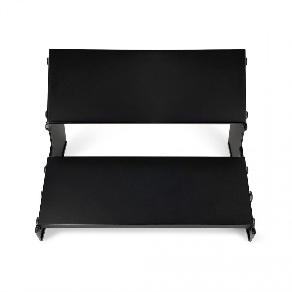 Der 2-stufige Stand schafft zusätzlichen Platz auf dem Schreibtisch, indem Geräte vertikal gestapelt werden. Gleichzeitig werden sie in einem optimalen Winkel geneigt, was sowohl die Körperhaltung als auch den Workflow verbessert. Die beiden 15,5-Zoll-Ablagen bieten jeweils Platz für bis zu 4 Pedale oder 2–3 kleine Synthesizer bzw. Geräte.
