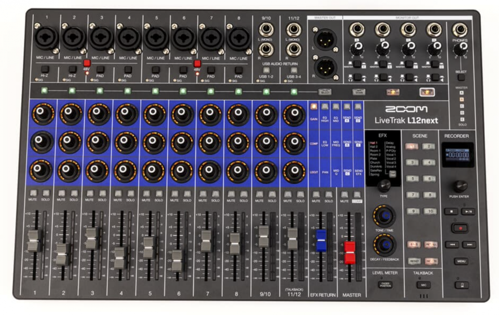 Der L12next bietet bis zu 10 Szenen-Speicherplätze, die jeweils alle Fader-Positionen, EQ-, Pan- und Mute-Einstellungen, die Effekte und vieles mehr speichern. Laden Sie im Handumdrehen Mischungen für Live-Darbietungen oder für Studio-Aufnahmen.