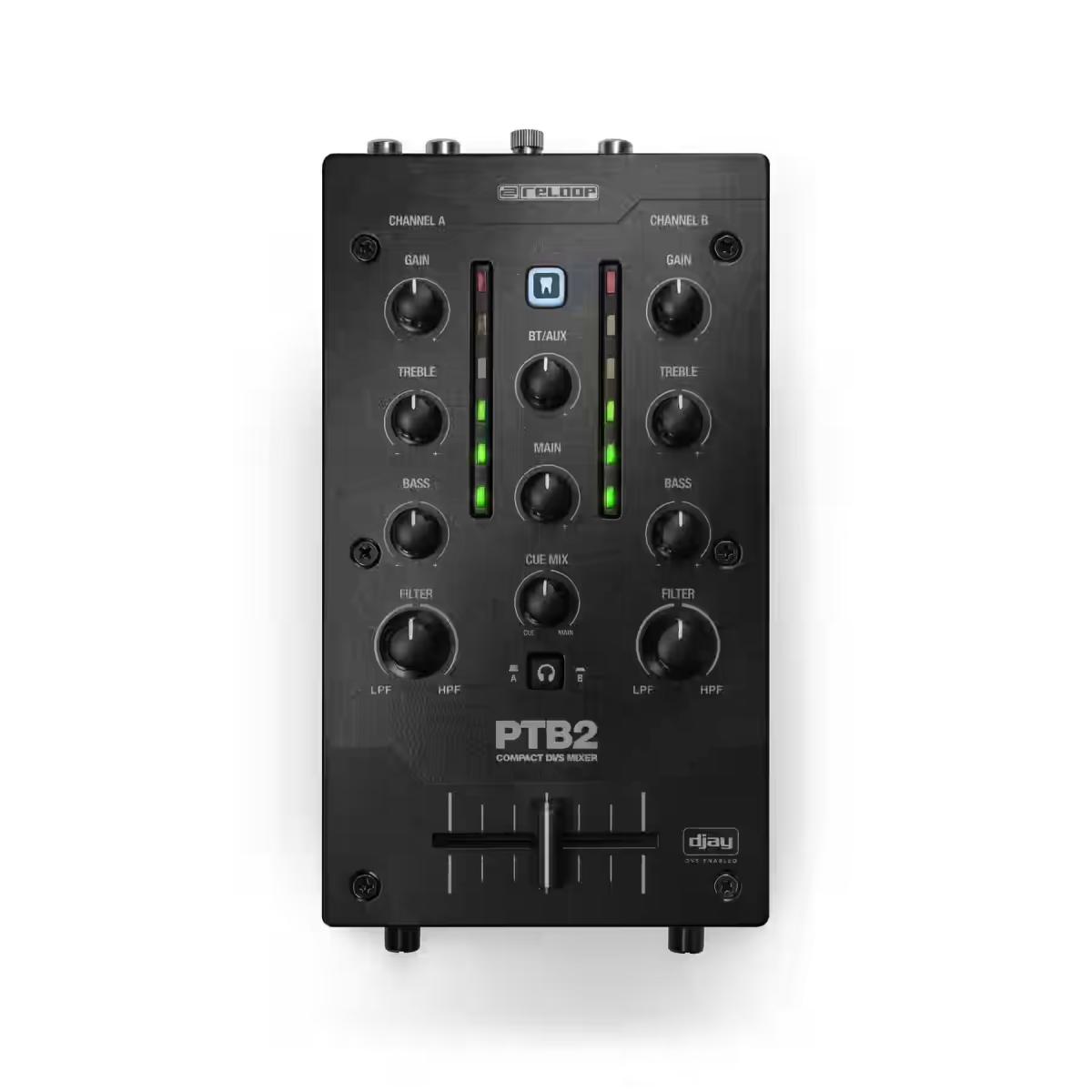Reloop PTB-2 – Ultra-kompakter 2+1-Kanal DJ-Mixer mit USB-C Audiointerface und Bluetooth