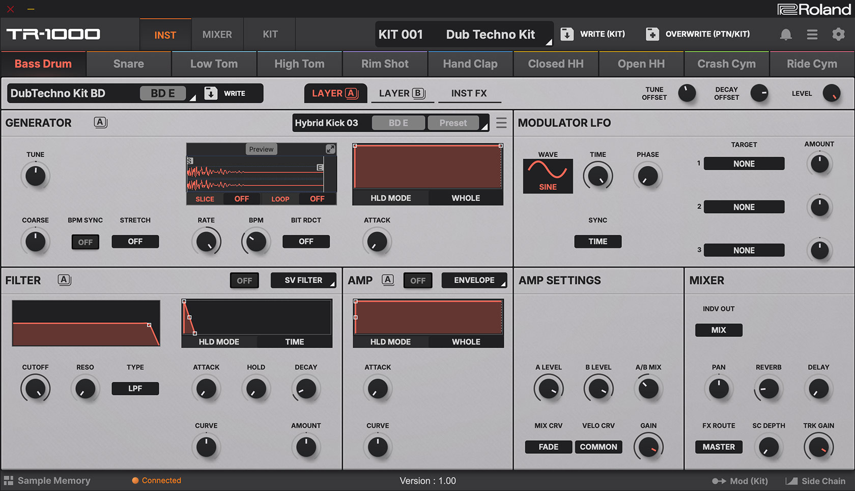 Die direkte Steuerung und intuitive Bedienoberfläche der TR-1000 ermöglichen Klangmanipulationen in Echtzeit – von subtilen Anpassungen bis zu markanten Transformationen – unterstützt durch einen modernen Sequenzer und umfangreiche Sounddesign-Tools.