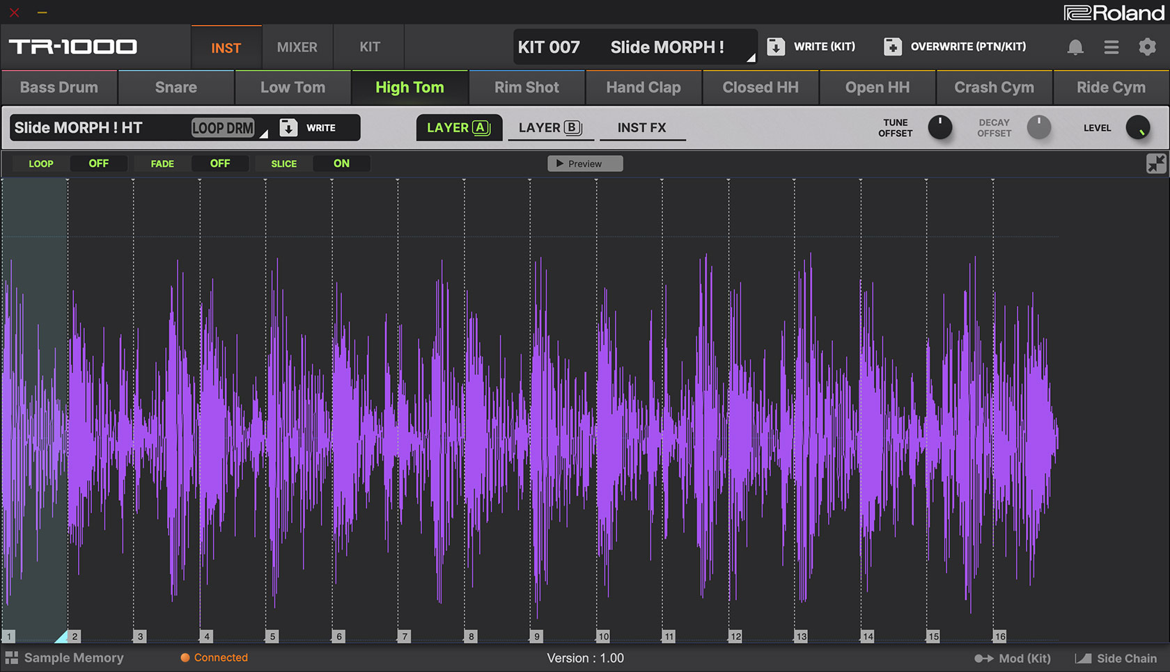 Die umfangreichen Sample-Werkzeuge fügen sich nahtlos in den TR-1000 Workflow ein, darunter Stereo-Sampling und Resampling, BPM Sync, Timestretching und nicht-destruktives Slice-Editing. Der interne 64 GB Speicher beinhaltet eine Sammlung an 2.000 ausgewählten Samples – die restlichen 46 GB stehen für eigene Aufnahmen, Bearbeitungen und Sample-Importe bereit.