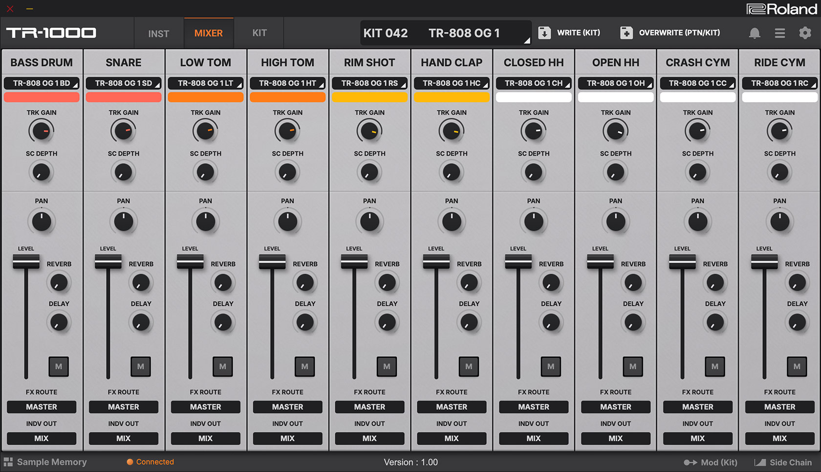 Complete kit and instrument editing with layered parameters, FX, and mixer views