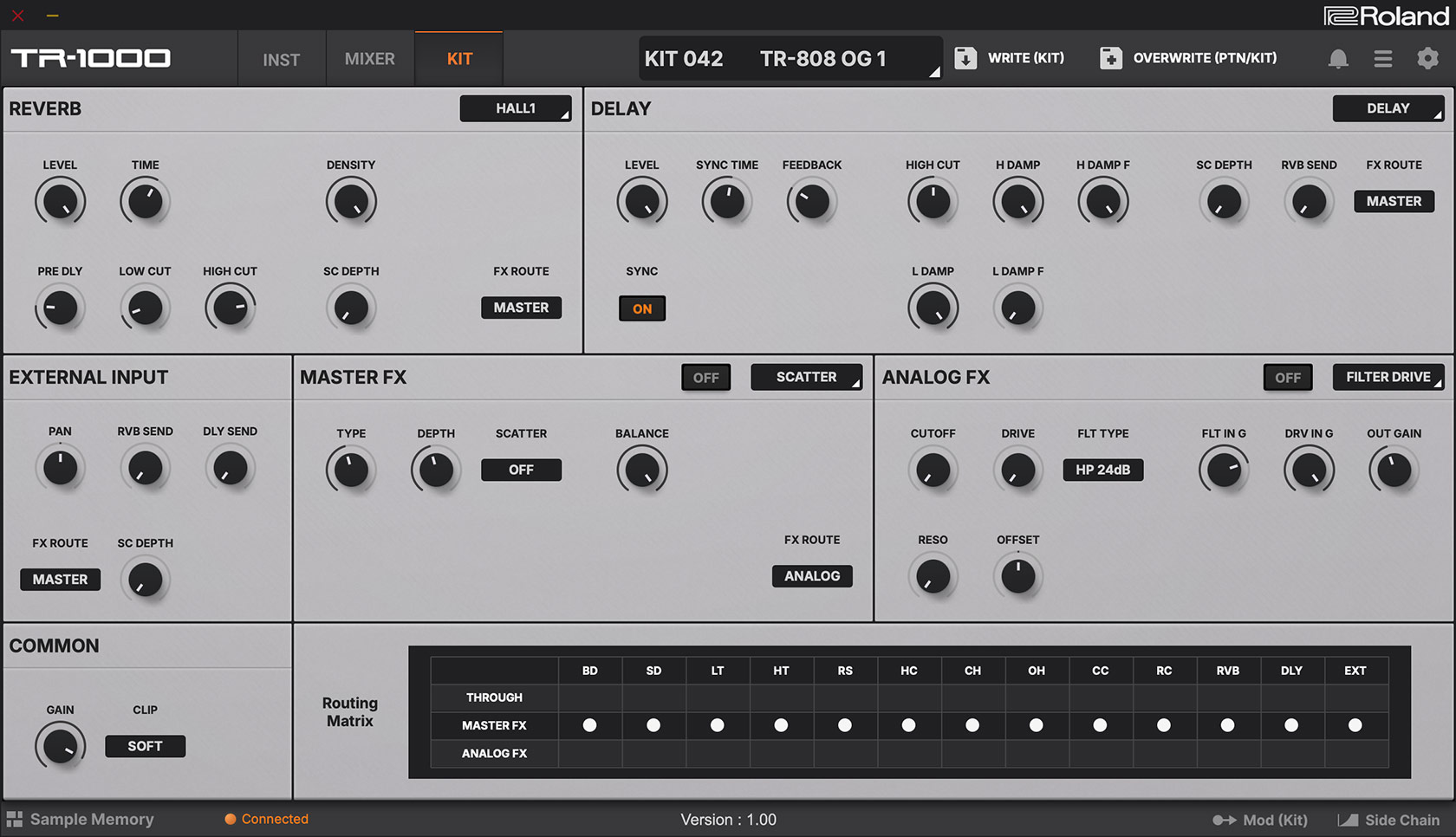 Die umfangreiche Effektauswahl der TR-1000 beinhaltet ein neues, analoges State Variable Filter (SVF), das sich an klassischen OTA-Designs orientiert, einen eigenständigen analogen Drive-Schaltkreis sowie digitale Highlights wie Crusher, Filter, Isolator, Saturator, Pitch Delay, Flanger und viele mehr. Zudem stehen Reverb- und Delay-Sends für jeden Track sowie eine Reihe von Master-Effekten für die Summe zur Verfügung.