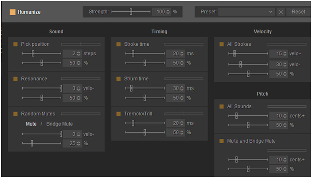 Die Humanize Section verleiht sowohl den Live eingspielten als auch den programierten Gitarren Spuren, Authenzität und Realismus.