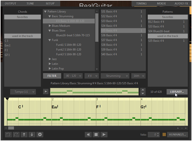 Die Gitarren Rhythmus-Pattern-Technologie mit einen leistungsstarken Pattern-Manager und einer riesigen MusicLab Gitarren Pattern Library, beinhaltet 1250 Gitarrenrhythmen zum einfachen Erstellen von Gitarrenbegleitungen.