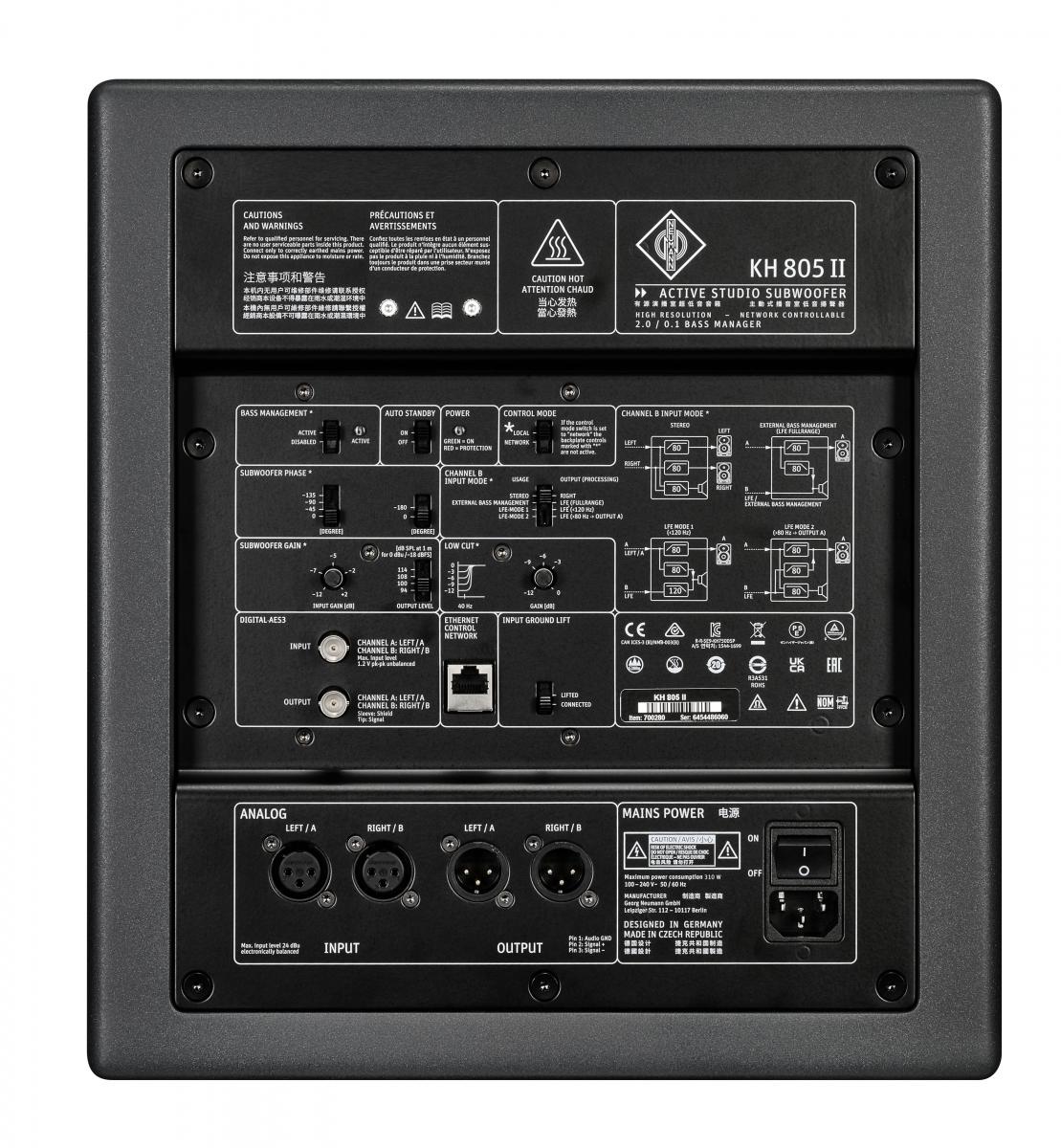 Der KH 805 II ist DSP-gesteuert und bietet so eine hervorragende Klangqualität und nahtlose Integration über MA 1 Automatic Monitor Alignment (separat erhältlich). In Kombination mit analogen Neumann-Studiomonitoren wie dem KH 120 A (nicht mehr lieferbar), KH 310 oder KH 420 bietet er genügend DSP-Leistung, um das gesamte Stereosystem mit MA 1 abzustimmen und so nicht nur den Frequenzgang, sondern auch die Phase zu optimieren. Der KH 805 II ist somit ein umfassendes Upgrade für bestehende Systeme. Natürlich ist der KH 805 II auch eine perfekte Ergänzung zu Neumanns DSP-kontrollierten Studiomonitoren.